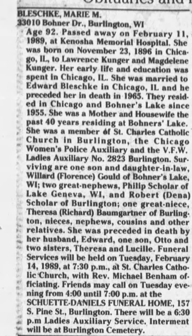 1989 Obituary of Marie Bleschke in The Journal Times, Racine Wisconsin