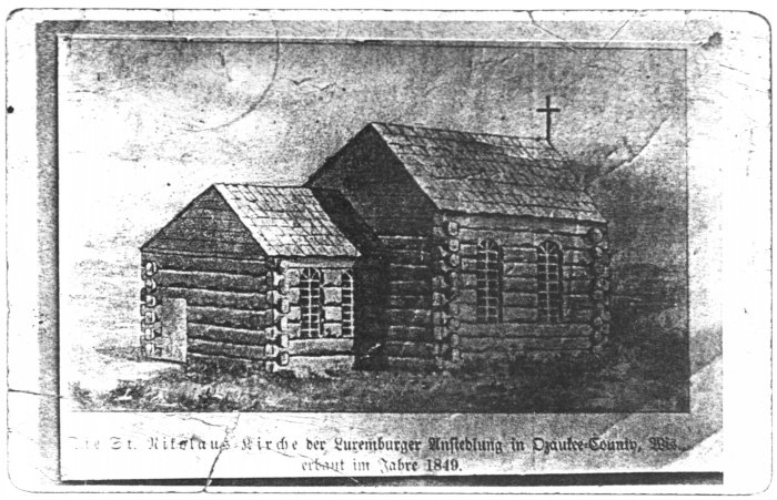 | Saint Nicholas Catholic Church as it looked in 1849. On the back it says "Built by August Hansen." |