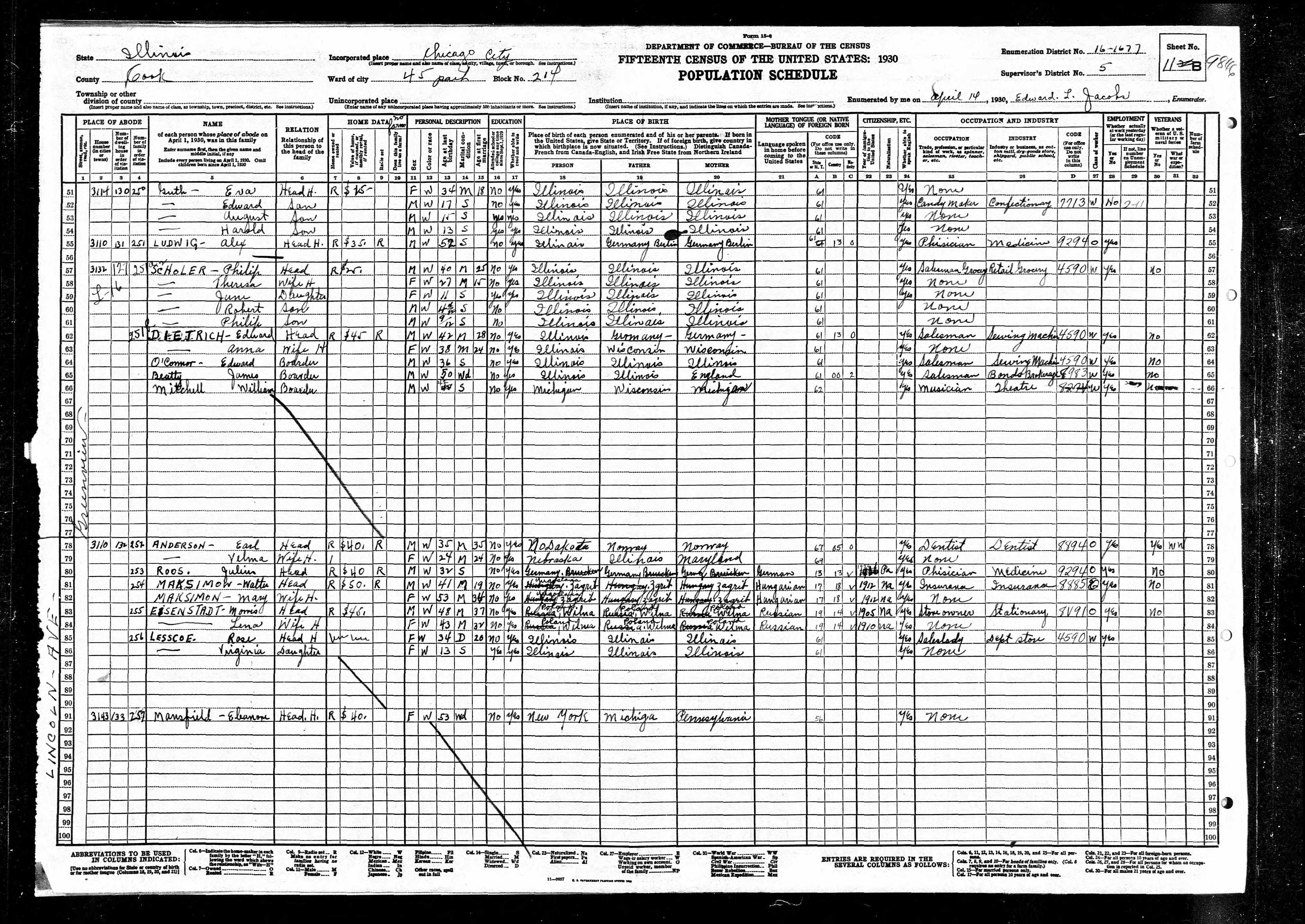 3915 N. Nora Ave.; Fred A 42 Il., policeman for city; Lucille A 40 IL; Fred A 6 son, IL; Robert J. Scholler 14 nephew; Philip E Scholler 10 nephew
