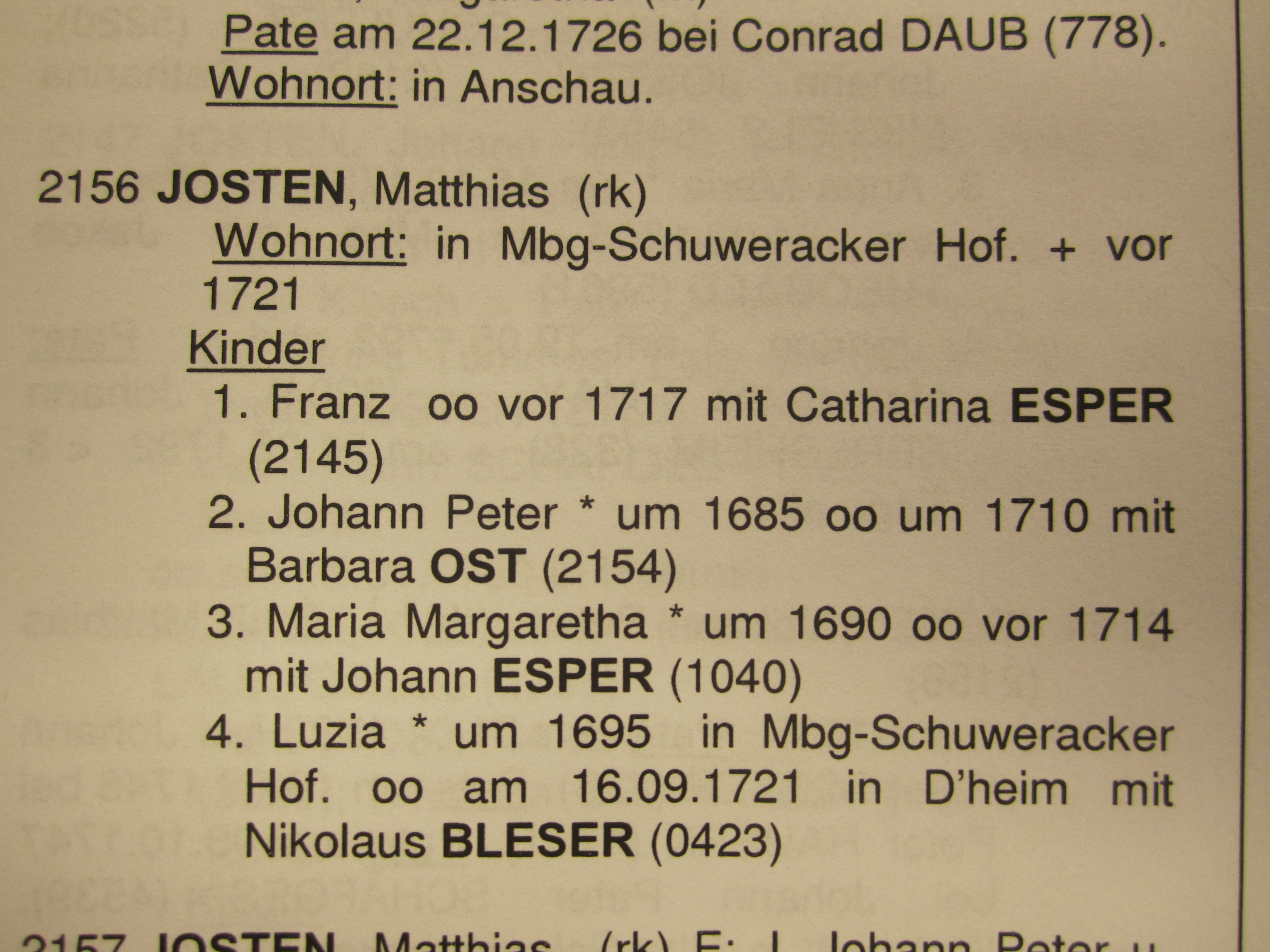 | Luzia JOSTEN 54 | about 1695 in Masburg-Schuweracker Hof 54 | Nikolaus Bleser () on Sep. 16, 1721 in D'heim, Germany 54 |