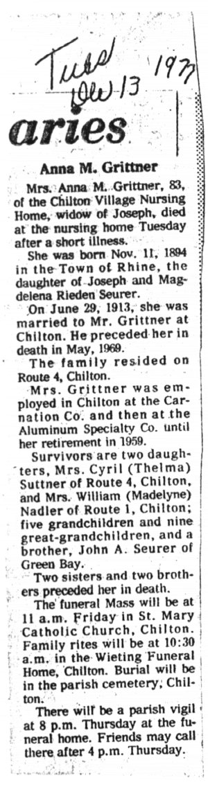 Mrs. Anna M. Grittner, 83, of the Chilton Village Nursing Home, widow of Joseph, died at the nursing home Tuesday after a short illness.