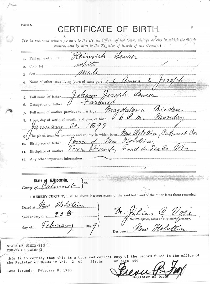 Now my side: I was born January 30th 1899 Town of New Holstein Calumet County.