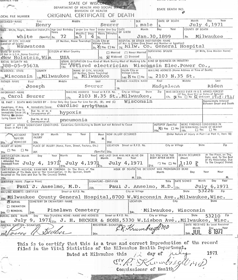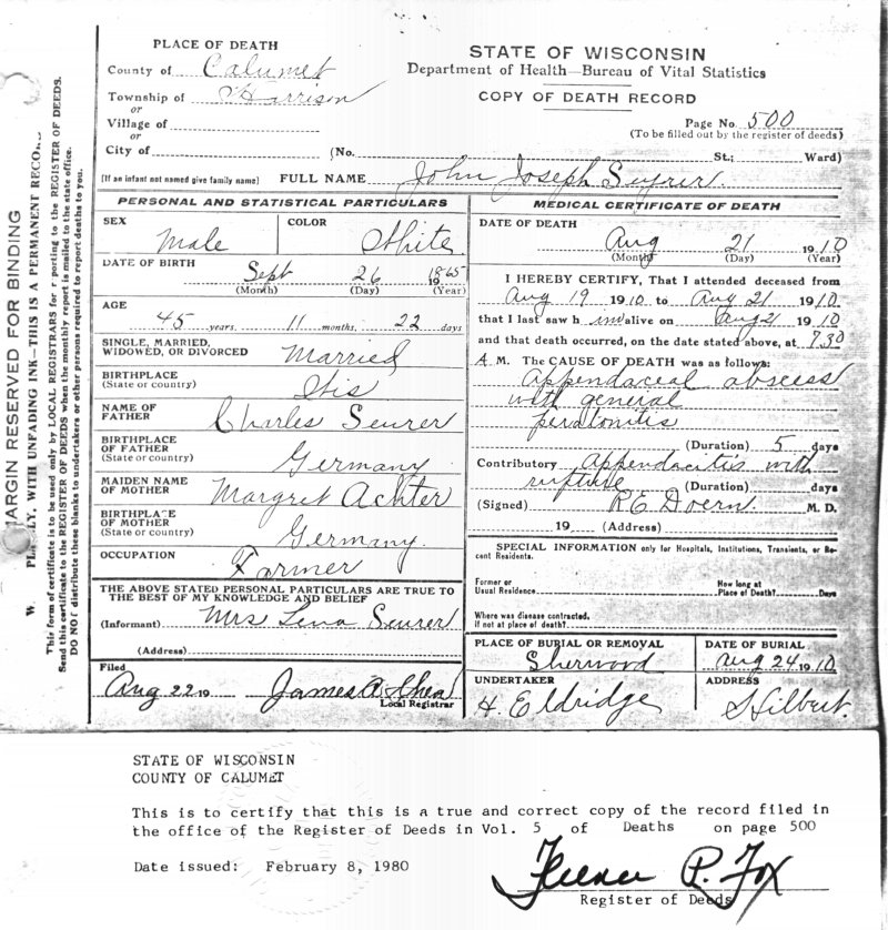 No Death Certificate for Carl Seurer in Calumet County Register of Deeds. July 1978.