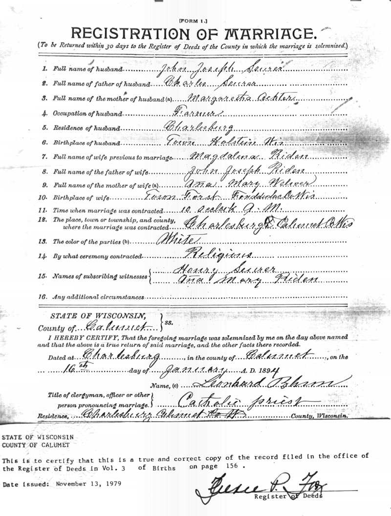 No marriage record for Margaret Achter and Carl Seurer at Register of Deeds for Calumet County, Chilton, Wisc. 53014. Oct. 22,1979.