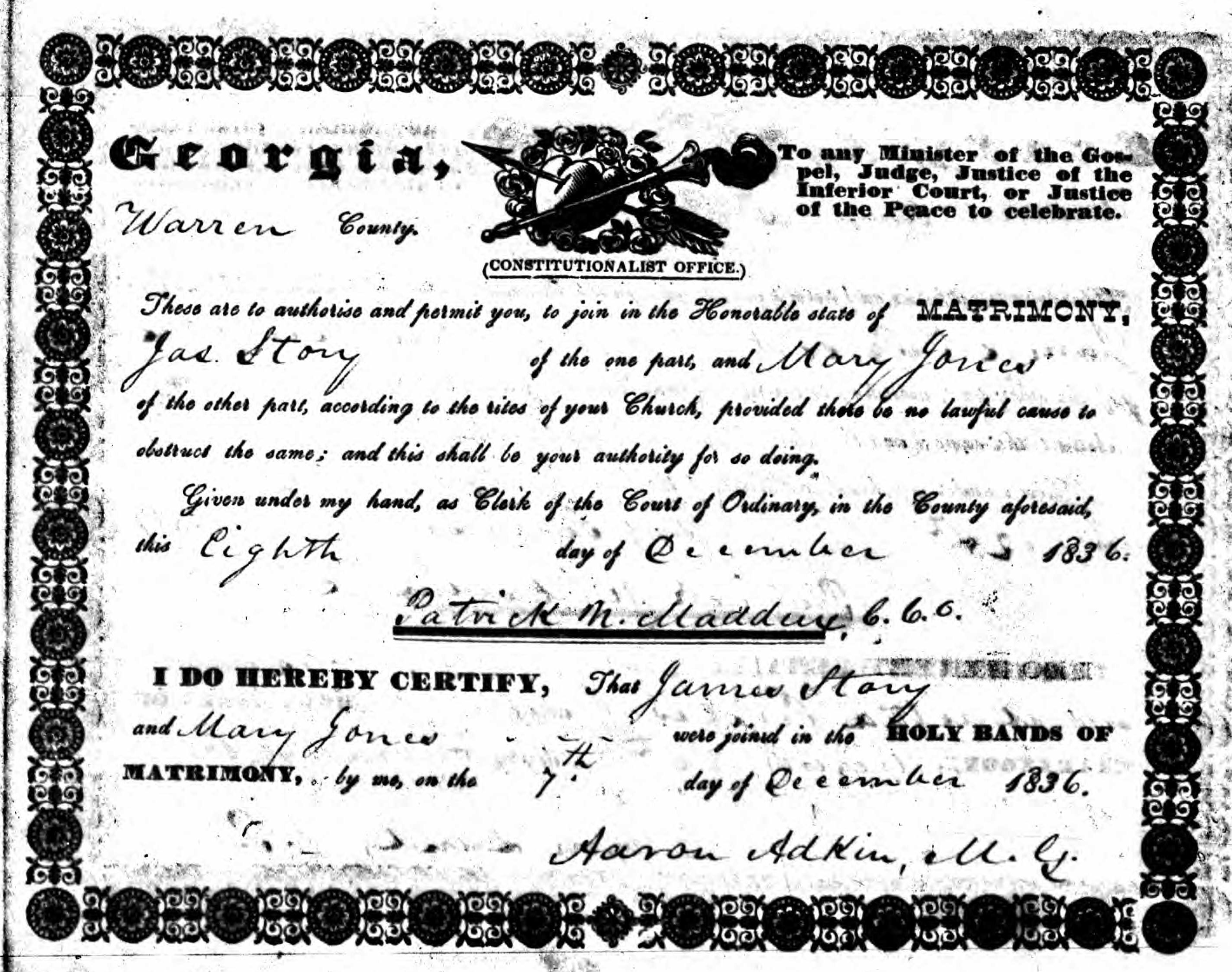 James Story and Mary Jones joined in matrimony on 8 Decembr 1836 by Aaron Adkins. | |