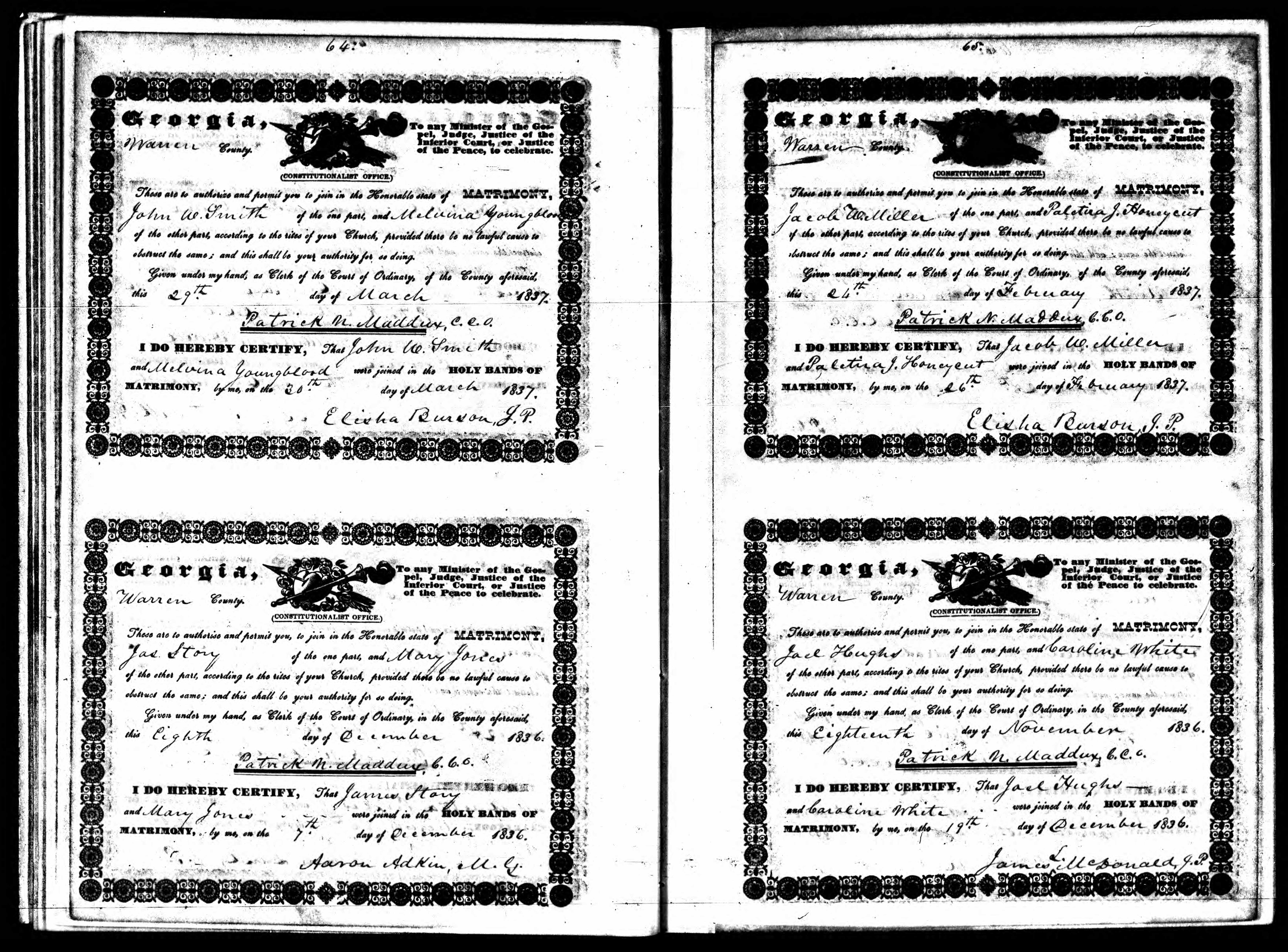 1836 Marriage Certificate, Warren County, Georgia from