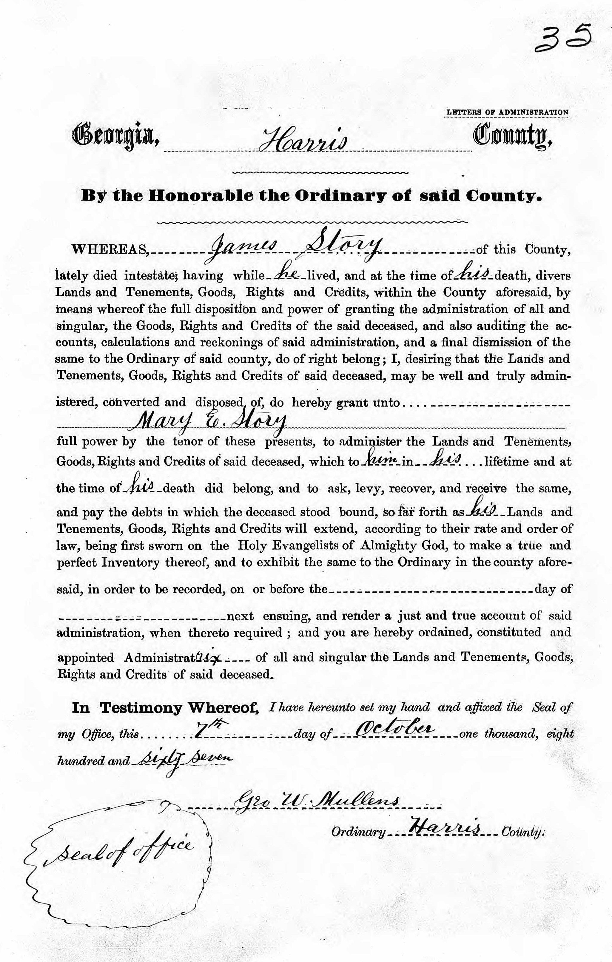 James Story lately died intestate. Mary E. Story granted full power to administer the lands, etc. Done 7 October 1867. | |