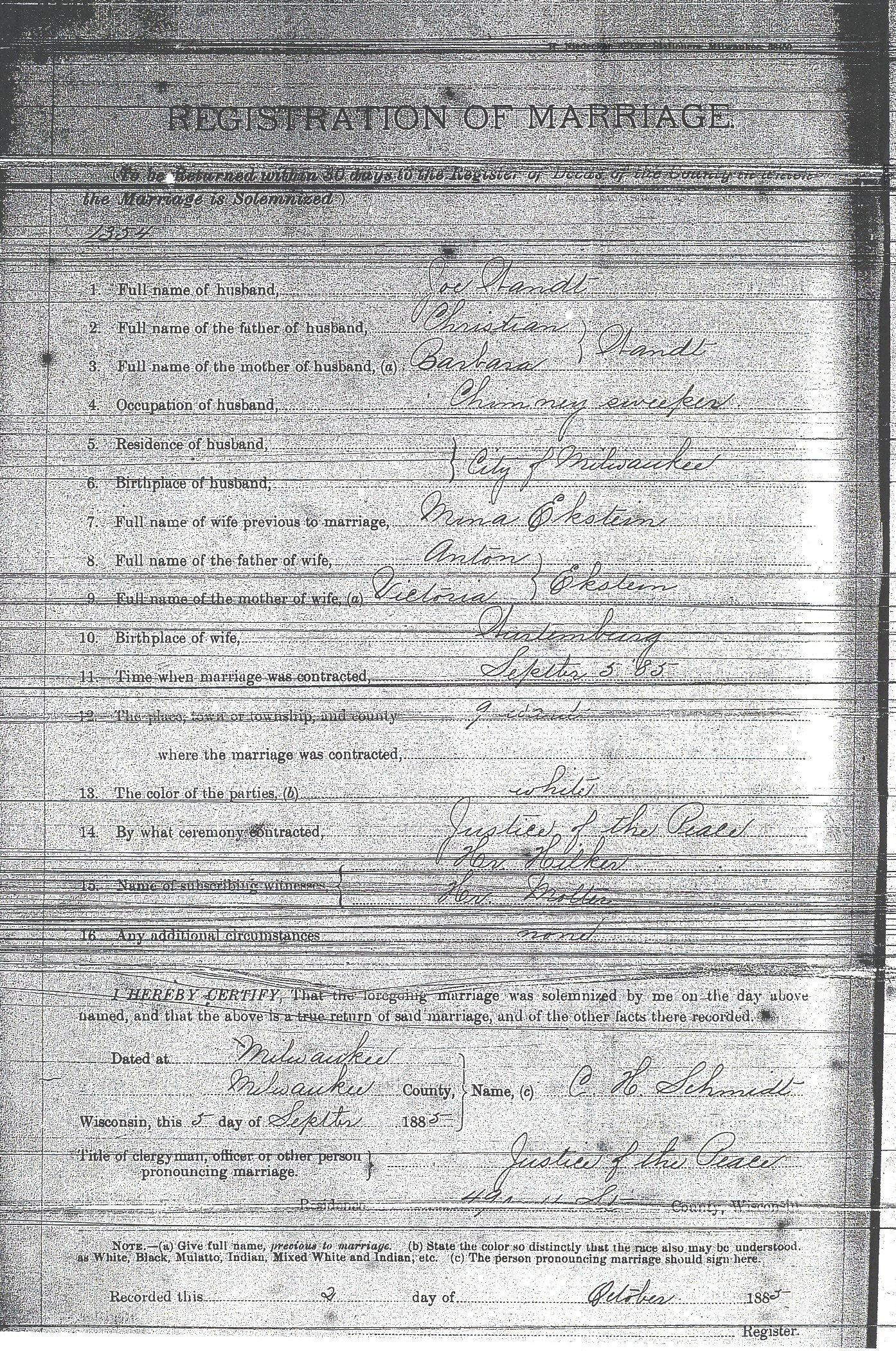 | 11b 1885 Marriage Record of Joseph Wandt and Mina Ekstein | |